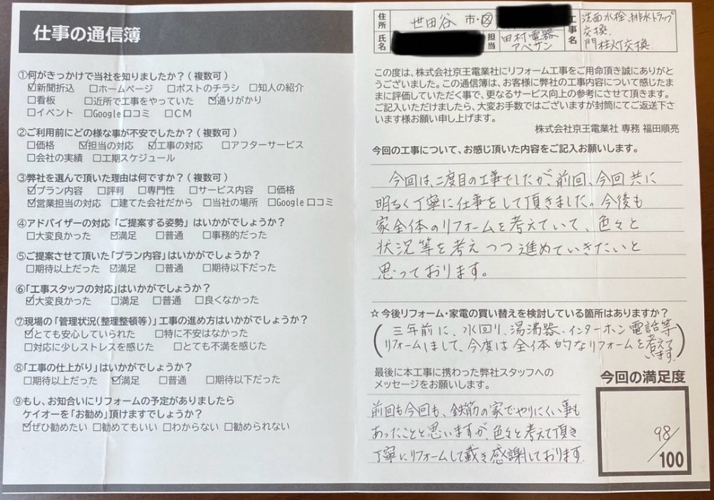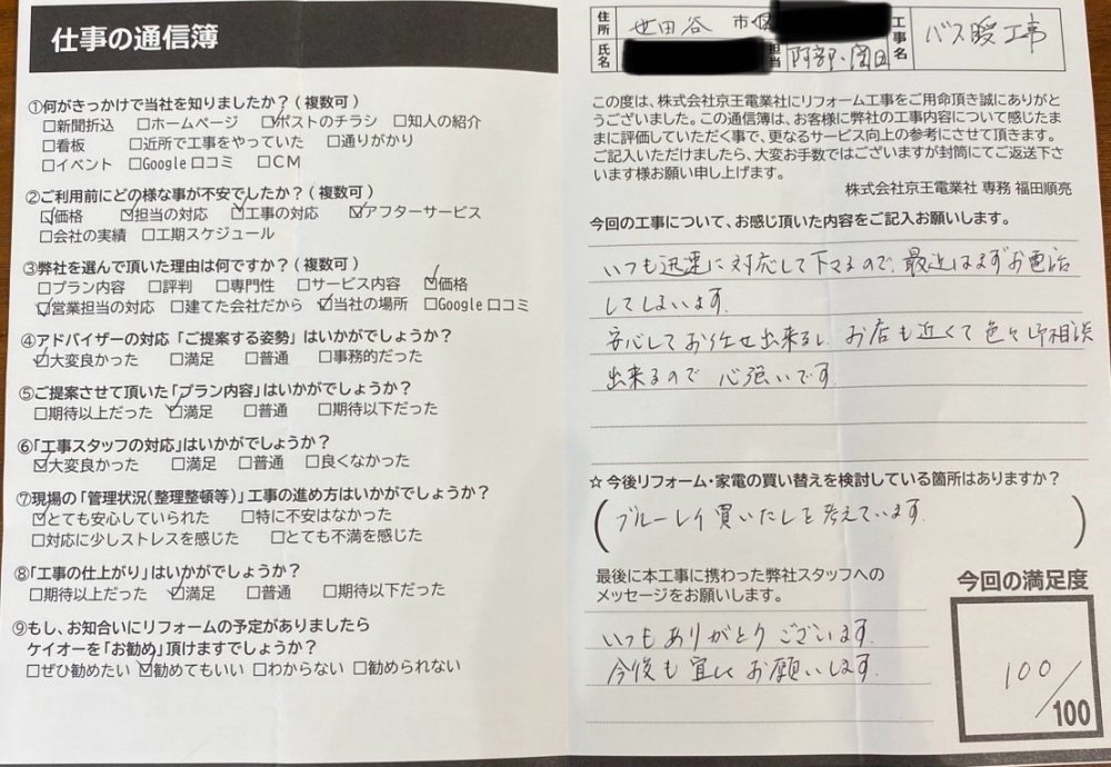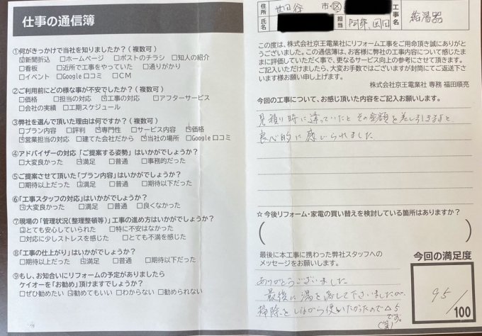 今回は2度目の工事でしたが、前回今回共に明るく丁寧に仕事をしていただきました。今後も家全体のリフォームを考えていて、色々と状況等考えつつ進めていきたいと思っております。