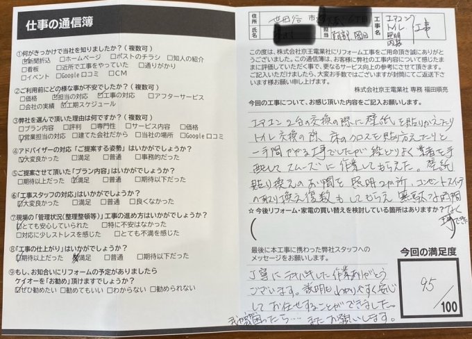 エアコン2台の交換の際に壁紙を貼りかえたりトイレ交換の際 床のクロスを貼りかえたりと一手間かかる工事でしたが段取りよく業者を手配してスムーズに作業してもらえた。壁紙貼りかえのあい間を照明2か所、コンセントスイッチの取り換え複数もしてもらえ無駄な時間なく工事できた。