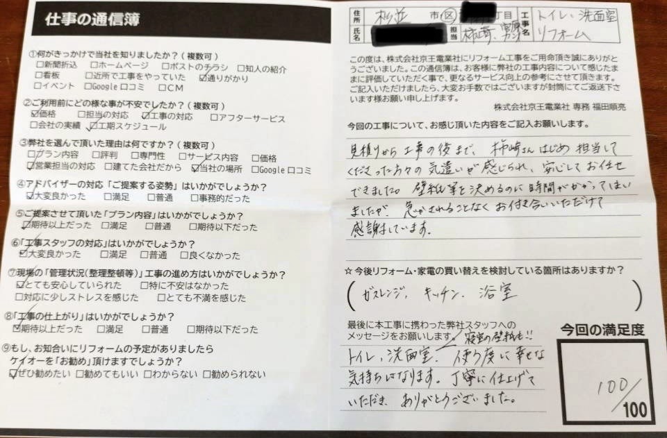 見積りから工事の後まで、柿崎さんはじめ担当してくださった方々の気遣いが感じられ、安心してお任せできました。壁紙等を決めるのに時間がかかってしまいましたが、急かされることなくお付き合いいただけて感謝しています。
